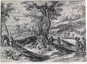 Eau-forte, cuv. 37 x 50,3 cm, papier vergé filigrané (filigrane non identifié), fixée par les coins sup. sous passe-partout (rognée sur la cuvette). Les mois de juillet et août représentés dans 1 grand tableau animé de laboureurs et de voyageurs, le tout situé dans un vaste paysage avec des paysans se régalant ou se reposant sous un grand arbre au milieu et une forteresse sur une hauteur. Importante et jolie planche d'une suite de 6, considérée comme l'une des oeuvres majeures de l'artiste.