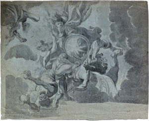 DESSIN ORIGINAL, fusain et lavis d'encre grise, papier gris-bleu filigrané (aigle bicéphale), 40 x 49,5 cm, fixé par les coins sup. sous passe-partout (faible trace de pli vertical). Scène figurant Saint Michel terrassant les anges rebelles d'après la composition fournie par Rubens pour le plafond de l'église des Jésuites à Anvers (c. 1620).