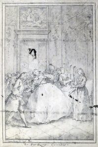 1738. DESSIN ORIGINAL, mine de crayon, 16 x 11 cm, sur PEAU DE VÉLIN, légendé sous le TC, signé et daté en bas à g. (qqs taches d'encre noire). Dessin non retenu pour le frontispice d'une comédie d'Antoine de Ferriol, comte de Pont-de-Veyle (1697-1774), "Le fat puni. Comédie avec un divertissement, représentée pour la première fois par les Comédiens François, le 7 avril 1738", éditée à Paris chez Prault en 1738.