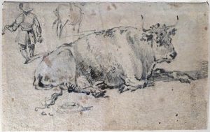 [Attribué à BERCHEM, Nicolaes (1620-1683)].- Boeuf couché, un homme vu de dos à l'arrière-plan. Étude.