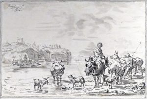 [Suiveur de BERGHEM, Nicolaes (1620-1683)].- Vue aquatique figurant un couple de paysans avec mules, une vache, des chèvres et une chaloupe.