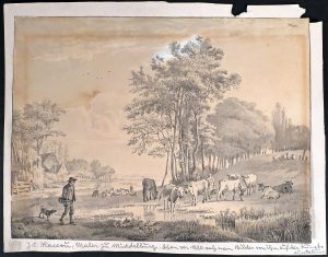 HACCOU, Johannes Cornelis (1798-1839).- Vue aquatique boisé avec vaches et fermiers.