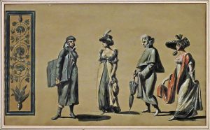 AQUARELLE ORIGINALE sur croquis au crayon, 26,5 x 42,5 cm (à vue), non signée ni titrée. Sous vitre, passe-partout et cadre de bois vert céladon et rouge. Titre et attribution à "Regemortes" [sic] au verso du cadre (cfr étiq. provenant d'un ancien cadre ou d'un catalogue d'exposition ?). La "patte" de Regemorter, plus classique, ne se reconnaît pas dans cette légère caricature de deux hommes et deux femmes, "fashion victims" et poseurs du tout début du XIXe s. (époque Consulat et Directoire).