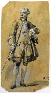Jeune femme en costume du XVIIIe siècle vue de dos. Plume à l'encre de Chine, papier calque, 16 x 7,7 cm, fixé par les coins sur f. de support (coins coupés).-- Homme en costume du XVIIIe s. Plume à l'encre de Chine, rehauts de blanc, papier calque, 13 x 7 cm, idem.-- Femme assise. Mine de graphite, 14 x 13 cm, papier vélin, idem.