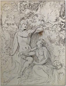 THELEN, Franz (Belgique 1826-?).- Allégorie ou Scène mythologique (?) : dans un fond arboré, une femme aux seins nus pose un bras sur le genou levé d'un homme nu portant une cape.