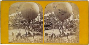 Photographie stéréoscopique, 17,9 x 8,8 cm, de l'ascension du ballon Godart lors de la Fête à Saint-Cloud en 1863 (lég. passée).