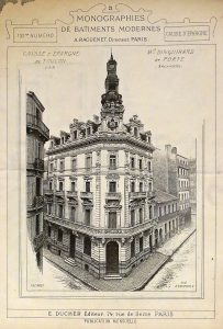 Paris, A. Raguenet [- Ducher], [circa 1900]. Fascicules de 4 ff. in-f° chacun : n° 2-159 et 193 (n.c., manquent n° 1, 13-14, 22, 50-66, 85-86, 90-109, 117-119, 123, 139, 151, 153-157, certaines couv. salies, bords des ff. salis, qqs-uns peut-être incomplets d'un ou plusieurs feuillets). Chaque numéro est consacré à l'étude architecturale d'un bâtiment ou d'une maison.
