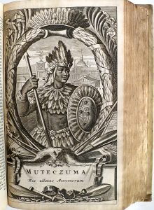 Amsterdam, Jacob van Meurs, 1670. In-f° : gegraveerde titel, portret, [6]-585-[27] pp., 16 kaarten waarvan 1 uitvouwbaar en 32 grote zichten waarvan 2 uitvouwbaar en 30 op dubbele blz., 6 portretten op enkele blz., 66 tekstfiguren (gegraveerde titel heringebonden, enkele platen kort afgesneden, marginale inscheuring met klein verlies pl. p. 220, pl. p. 470 licht gebruind, bleke watervlek bovenaan vol., 3 tekstbladen met onregelmatige randen, enkele mispagineringen). Eigentijdse band : perkament, rug met ribben, platten met lijnenkader en centraal medaillon in blindstempeling (scharnieren gebarsten, lichte gebruikssporen op de band). EERSTE UITGAVE van deze compilatie uit verschillende auteurs en handschriften welke door Dapper zal vertaald worden in het Duits en door Ogilby in het Engels. Eerste en mooie afdruk van de kopergravures : kaart van Noord- en Zuid-Amerika door Gerard Schagen (wiens naam niet vermeld wordt in de latere uitgaven), 7 portretten (Maurits van Nassau aan wie het werk is opgedragen, Colombus, Vespucci, Magellaan, Athabaliba, Moctezuma en Pizarro), 32 mooie zichten op dubbele bladzijde (Mexico, Porto Rico, een Spaans fort in Florida, Havana, Haïti, een Mexicaanse afgod, Lima, Cuzco, Olinda in Brazilië, San Salvador de Bahia, de Amazone, Boavista, Suriname ...), 15 kaarten op dubbele blz. (Virginia, Florida, de Bermudas, Centraal Amerika, Acapulco, Yucatan, Peru, Brazilië, Guyana, Venezuela, Chili, de Straat van Magellaan ...) en 66 prenten in de tekst betreffende fauna en flora uit de verschillende landsstreken (lamas, walrussen, apen, gordeldieren, of ... het gevecht tussen een arend en een éénhoorn), taferelen van plechtigheden en offers, spelen, gevechten, kannibalisme, portretten van inboorlingen, stadszichten ...