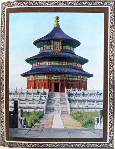 Shanghai, The Commercial Press, ( 1927). In-f° : [2]-154-[1] pp. Publisher's binding : embroidered fabric in brocade with Temple of Heaven in the center and the title within a decorated frame, flat spine (emblazoned bookplate at the upper boardplate). In a cardboard box of which the top is illustrated with a landscape. Illustrated with 71 (and not 70, cfr title) photographs in full-page in a decorative frame of which 12 in colours : Summer Palace, Forbidden City, Porcelain Pagoda, Western Hills, Temple of Heaven, the Observatory, etc., and some testimony of religion (Temple of Buddha or Lama Temples).
