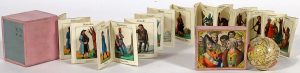 [ Nuremberg, 1800-1825]. Globe : copper engraving, diameter 4 cm, colored; booklet of 28 engraved plates vowed in accordion, 4,5 x 5,5 cm, colored, pasted to the bottom of the box. In original pink card box (5,5 x 6,5 x 6 cm). CHARMING VICTORIAN TERRESTRIAL GLOBE made up of 12 hand coloured engraved paper gores. With booklet of 28 plates showing people of all nations in traditional costumes, each labeled in English and German. Illustrated label on the lid of the box. Though it differs from the one recorded by Van der Krogt, it holds the same maker's initials "C.B." and should be as such a RARE VERSION of the globes the Bauer family produced as a gadget for the market. Vancouver 's discoveries at the end of the 18th century are recorded at the northwest coast of America. Handwritten notes on the bottom of the box.