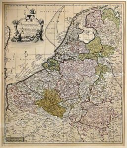Amsterdam, Reinier & Josua Ottens, [ 1715-1737]. Kopergravure, TC 50,7 x 59 cm + marges, ingekleurd (linkerbenedenhoek gerestaureerd). Onder passe-partout, glas en bruine houten omlijsting (niet uit de lijst gehaald). EERSTE STAAT (van 2), gepubliceerd o.a. in Ottens' "Nieuwe Atlas inhoudende de vier gedeeltens der Waereld" (1705-1759). Weergave van de herverdeling van de gebieden bij de Vrede van Utrecht in 1715. Ronde cartouche versierd met Nederlandse leeuw en twee zeegoden.