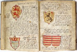 16e s. In-4° : 159 ff. (incomplet du f. 6, ff. 112-119 reliés à l'envers, taches et salissures passim, coupure recollée f. 53, plusieurs ff. remargés). Rel. moderne pastiche : bradel plein vélin à petits rabats, dos lisse, liens de fermeture en peau (mention de cote ms. sur la garde et le plat sup. de la rel.). Manuscrit en français datable du 16e s., orné de façon rudimentaire de quelques grandes lettrines et plus de 80 GRANDES ARMOIRIES, la plupart PEINTES et quelques-unes restées vierges, relatant la vie des évêques de Tongres et Liège en commençant par Materne [c. 325-344], suivi de Navite, Marcel, etc., en passant par saints Agricola, Monulphe et "le comencement de la noble cyté de Lyege", Hubert (longue notice), Francon (présenté comme le premier évêque, et ses rapports avec Ogier le Danois), etc.; les notices devenant de plus en plus longues à partir d'Otbert (1091-1119). Le manuscrit termine en 1462 pendant l'épiscopat de Louis de Bourbon qui sera assassiné vingt ans plus tard sur ordre de Guillaume de La Marck mais présente un petit rajout à propos de trois bourgeois de Liège décapités en 1605. Les biographies sont accompagnées de faits remarquables et entrelardées de miracles, d'histoires religieuses ("les XI. mylle vierge martyryse a Collongne" i.e. les 11.000 vierges martyres de Cologne; le miracle de saint Martin), de légendes (Charlemagne et la chanson de Roland avec la trahison de Ganelon) ou de faits historiques (achat du duché de Bouillon en 1098, victoire de Steppes grâce aux reliques de saint Lambert en 1213, etc.). La chronique est précédée de 5 ff. relatifs à l'histoire de la fondation de Tongres et Liège.