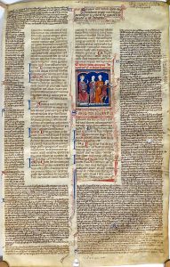 Paris, fin du 13e siècle. Parchemin, 41 x 25,8 cm (3 perforations dont seulement 1 affectant le texte). Fragment du "Codex Juris Civilis", donné en 529/534 par l'empereur byzantin Justinien (483-564), comportant la fin du chapitre V. et le début du chap. VI., le dernier traitant du jugement de l'esclave fugitif. Texte sur 2 colonnes rubriqué en rouge et bleu et orné d'une grande et jolie enluminure (5,8 x 5,3 cm, peinte et rehaussée d'or à la feuille). Avec des gloses e.a. par Francesco d'Accorso (1225-1293), juriste bolonais.