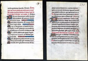 Cinq feuillets de livres d'heures différents, textes en latin et en français, 4 ff. ornés de lettrines peintes et rehaussées d'or peint ou à la feuille.