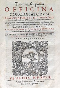 (1). [TIBULLUS, Albius.- Elegiae.-- CATULLUS, Valerius.- Carmina.-- PROPERTIUS, Sextus.- Carmina]. (Venise, Simon Bevilaqua, June 26th, 1493), 157 (on 158) ff. (f. a1 missing, spotting, some handwritten notes, binding lacking). A close reprint of Locatellus's 1491 edition of texts by Tibullus, Catullus and Propertius with the commentaries of Bernardino Veronensis, Antonius Parthenius and Philippis Beroaldus. # BMC V 517; # Goff T-373; # Hain 4764; # Polain 4767.-- (2). SEVERINUS, Lubomlius.- Theatrum seu potius officina concionatorum praedicatoribus et theologis in scientia speculativa sancti Thomae haud mediocriter versatis [...]. Apud Societatem Minimam (Petrum Dusinellum), 1597, contemporary vellum binding, [8]-225-[2] pp. (some foxing, binding soiled and loose, spine lacking). First edition by the Polish theologian Lubomlcyzk Seweryn (1532-1612). Title printed in red and black, large title vignette and printer's mark on the last page. Provenance : Bibliotheca Augustiniane Lovani (handwritten note); A. Le Rebours (ex-libris). # USTC online 838706; # Adams S-1018; # not in Machiels, Soltész.