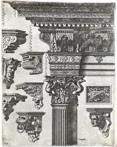 (5). [Ordre composite]. Suite de 22 pl. num. (pl. 18-19 inversées lors de la rel., pl. 19 reliée tête bêche, plusieurs pl. fatiguées avec qqs mauvais encrages). La pl. 1 porte la mention "Vriese inventor Cock excudebat 1563", les pl. 3, 13 et 16 la mention "Vriese invent." (avec la date 1563 sur la pl. 16), les pl. 13 et 22 la mention "Cock excu.".