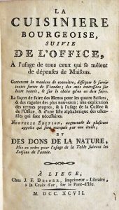 Liège, J.F. Desoer, 1797. In-12° : 536 pp. (bonne condition pour ce type d'ouvrage hormis qqs pet. galeries de vers sur la garde et les 1ers ff.). Rel. de l'époque : plein veau marbré, dos fleuronné doré à nerfs, tr. rouges (très lég. us.). RARE ÉDITION LIÉGEOISE, inconnue à de Theux (éd. orig. : Paris, 1746). Souvent réimprimé, ce texte attribué à Menon fut régulièrement augmenté et rajeuni jusqu'au 19e s. Dans cette édition, l'auteur porte son attention sur les menus des quatre saisons, des ragoûts nouveaux et propose une liste des termes techniques et une autre des ustensiles à posséder. Contient également une partie pâtisserie (parmi les meilleures recettes du 18e s.), glacerie et des recettes de conservation. Les "Dons de la nature" présentent un calendrier des productions de la terre et de la mer, des notions de technologie des produits et des conseils de "physiciens" (diététiciens) sur les qualités et propriétés de chaque aliment.