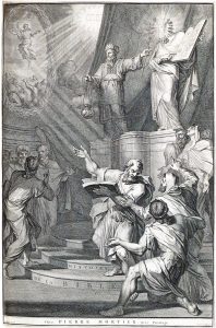 T' Amsterdam, Pieter Mortier, 1700. 2 dln in 3 vol. in-f° : [20 incl. gegrav. titelplaat]-128, [2]-129/282-[8], [28 incl. gegrav. titelplaat]-154-[12]-155/163-[11] pp.; 218 (op 219) pl. (kleine roestvlekjes, grote bruine vlek op 1 pl., enkele pl. gebruind, boekblok van vol. 2 licht gelost) Eigentijdse banden : halfleder met hoeken, platten van gespikkeld papier, goudgestempelde gladde ruggen (platten licht gewreven met kleine papiermanco's, slijtage aan plathoeken en -randen, ruggen gekrakeleerd, rug van vol. 3 gelost, onderste kapitalen beschadigd, bln onafgesneden). EERSTE UITGAVE VAN DE VERTALING door W. Sewel van deze prentbijbel bewerkt door David Martin (1639-1721), protestants theoloog en dominee van de Waalse kerk te Utrecht, en door de uitgever opgedragen aan A. Heinsius. Rijkelijk geïllustreerd met 2 frontispices, mooie hoofd- en slotvignetten en 213 kopergravures met 426 taferelen naar Ottomar Elliger, Jan Goeree, Gerard Hoet, Bernard Picart gegraveerd door Jan Luyken e.a. Bevat eveneens 5 kaarten op dubbele pagina (wereldkaart, het Paradijs, de tocht door de woestijn, het land Kanaän en de reizen van Paulus), alfabetische registers van Bijbelse plaatsnamen en een tijdrekening van de Heilige Schrift.