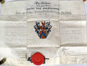 Brussel, 30 april 1827. Handschrift op perkament (61 x 72 cm), geschilderd wapenschild gehoogd in goud (14 x 15 cm), groot afhangend zegel in rode was (gevouwen). # Goethals II (1849); # Janssens & Duerloo, 1195.