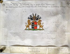 Copie conforme des lettres patentes concédant le titre d'écuyer avec les armoiries à Jean Henri Sigismond de Liem, ancien lieutenant-colonel, accordées par Guillaume Ier d'Orange-Nassau.