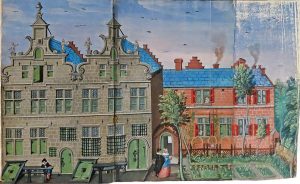 - GRANDE GOUACHE ORIGINALE, 43 X 72 cm (pl. dépliante dont le bord de la partie dr. est plié, couleur partiellement effacée dans la moitié sup. de cette même partie) figurant la FAÇADE DE LA MAISON ANVERSOISE des Sueyro dont le jardin jouxte celui de la MAISON DE RUBENS : sur le Meir et au coin de la rue des mousquetaires "que llaman en Flamenco de Kolvieniers straete", l'on voit de gauche à droite la maison double d'Emanuel François, l'entrée du couloir en plein air menant aux "Galerias", aux écuries et au jardin et dans laquelle deux promeneurs endimanchés s'engagent, ainsi que les "cozinàs" sur deux étages,