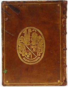 Augustae Eburonum [ Liège], excudebat Leonardus Streel, 1620. In-4° : [44] ff. (mouill. marg. ou dans le coin sup., qqs piqûres ou pet. taches éparses, 1res pp. très lég. brunies). Rel armoriée de l'époque : plein veau, plats armoriés cernés d'un double filet doré avec fleurons dans les angles, dos fleuronné doré à nerfs, tr. dorées ciselées (mouill. sur le plat sup. lég. passé, trace d'1 étiq. sur le même plat, épidermures sur le plat inf., pet. manques ou cuir fendillé au dos, restaurations aux coiffes, mors et coins, lacets de fermeture manquants, coupes fort émoussées, perforations dans la garde sup.). UNIQUE ÉDITION de cette éloge de la famille de Bocholtz par Gilselius, chanoine de la collégiale Sainte-Croix de Liège. Illustré de leurs armes.