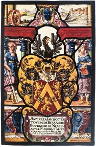 Neuchâtel, Éditions de la Baconnière, ( 1939). 2 vol. gr. in-4°; 2 frontisp. et 9 pl. (texte n.c., taches à qqs serpentes, couvertures orig. conservées). Rel. de l'époque : pleine percaline verte, dos lisses fleuronnés dorés avec étiq. de cuir rouge, tr. sup. jaspées de rouge (ex-libris armoriés sur les contreplats). ÉDITION ORIGINALE de ce recueil richement illustré de c. 2500 figures dans le texte, partiellement en couleurs, ainsi que de 9 planches en couleurs et 18 figures à pleine page représentant des vitraux, des sceaux et un tableau généalogique dépliant des prétendants à la souveraineté de Neuchâtel.