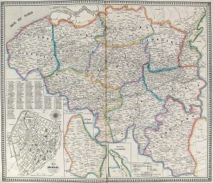 Bruxelles, D. Raes, 1846. In f° : [1] p.; 10 cartes montées sur onglet, limites coloriées (pet. déchir. dans les bords). Rel. de l'époque : demi-toile, plats de papier marbré bleu (dos cassé, fortes us. aux plats). ÉDITION ORIGINALE de cet atlas contenant une carte générale et une carte pour chaque province, avec les arrondissements communaux et les cantons de justice de paix. Publiées séparément, ces dernières étaient augmentées des tracés des voies ferrées avant d'être réunies dans cette édition.
