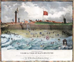 (1). Vue de la ville et bains d'Ostende dessinée au mois d'août 1834 pendant le séjour de SS.MM. le Roi et la Reine des Belges. D'après l'originale de Rottigni. Lithographie, 26 x 32 cm (à vue), rehaussée; sous passe-partout décoré, vitre et cadre de bois doré (non désencadrée).-- (2). STROOBANT, Fr.- Monuments et vues d'Ostende. Ostende, Buffa et Elleboudt, 1847, demi-percaline brune. Titre gravé et 11 pl.-- (3). Souvenir d'Ostende. Ostende, Brux., Blankenberghe, Claassen, [1855 ?], pleine percaline verte, plat sup. de percaline chagrinée brune avec titre cerné d'un encadrement fleuronné doré découpé dans la rel. précédente (déch., souvent restaurées, mouill...). 30 pl. rehaussées (18 d'après Canelle, 12 d'après Cham).