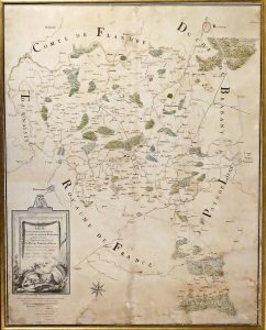 1793. DESSIN ORIGINAL, plume et lavis à l'encre bistre et rouge, aquarelle verte, papier vergé, 102 x 129 cm, collé en plein sur toile de support (qqs faibles taches). Encadrement de bois doré. GRANDE CARTE MANUSCRITE exécutée par de Fossez couvrant la région de Bruxelles à Chimay et de Tournai à Charleroi. La carte, avec indication des cours d'eau et des bois, peut être attribuée à l'architecte et arpenteur Chrétien-Henri-Emmanuel Fonson (1729-1798), directeur des Ponts et Chaussées. Il termina également le palais du marquis de Gages à Mons en 1763. Grand cartouche figurant un lion couché exécuté au lavis d'encre grise.