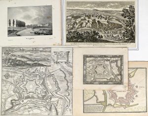 Techniques variées, formats divers (petit défauts sinon bon état général). Plans (12) dont 2 identiques par Fricx, 2 id. par la veuve du Sr. Du Val, 2 id. par Pierre Mortier, 1 par M. Merian.-- Vues topographiques (2) dont 1 par Aveline et l'autre par Jean-Baptiste Madou (1820-1877) d' après Otto von der Howen, gravée par Jobard.