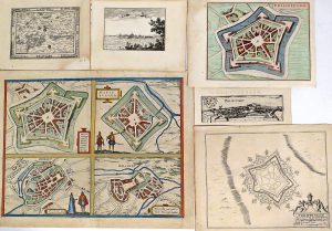 Techniques variées, formats divers, qqs-unes rehaussées de couleurs (petit défauts sinon bon état général). Cartes (10) dont 1 par Fricx, 2 id. par Nicolas de Fer gravées par H. van Loon, 1 extraite de l"Atlas national de France" édité par P.G. Chanlaire par P.A.F. Tardieu, 3 id. par Robert de Vaugondy et le graveur G. Delahaye.-- Plans (28) dont 1 par Blaeu, 1 par Braun et Hogenberg, 1 par Fricx, 1 par F. de Wit, 1 copie manuscrite d'après Robaulx de Soumoy, et les autres souvent identiques par Madou, Guicciardini etc.-- Vues topographiques (12) dont 2 id. 1 par Jean-Baptiste Madou (1820-1877) d' après Otto von der Howen gravées par Jobard et extraites du "Voyage pittoresque dans le royaume des Pays-Bas", 4 par Beaulieu extraites de "Les plans et profils des villes des principales villes et lieux considérables" et les autres par Canelle d'après A. Wasse etc.