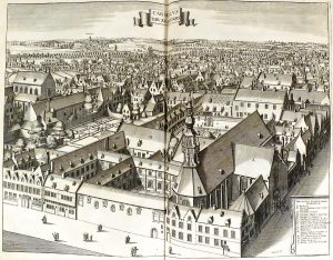 La Haye, Gerard Block, 1734. 2 tomes en 4 vol. in-f° : [6]-1/176, [1]-[1bl.]-177/394-40, [1]-[1 bl.]-212-[1], 134-14 pp.; ill. (incomplet de 4 pl. de monuments funéraires, très lég. brunis, certaines pp. ou pl. plus fortement, pet. rouss., plis dans le texte à la fin de la 2e partie du t. I, rares mouill. marg., papillons sur les signatures et la pagination du cahier Z au t. I de la 1re partie, gouttière d'une pl. de la 2e partie du t. II raccourcie). Rel. de l'époque : plein veau marbré, dos fleuronnés dorés à nerfs, tr. jaspées (lég. frottées par endroits, coiffes du vol. I absentes, manques à certaines autres, qqs coins fort émoussés). Seconde édition de la traduction en français (éd. orig. de la trad. : Van Lom, 1729). Cette importante chorographie ecclésiastique du Brabant, d'intérêt iconographique et généalogique, est divisée en 4 parties traitant de l'archevêché de Malines, du Brabant Wallon, des évêchés d'Anvers et de Bois-le-Duc. Son iconographie, gravée e.a. par J. Harrewijn et R. Blokhuyzen, comporte plus de 250 hors-texte sur simples, doubles pages ou dépliantes : 2 cartes géographiques, des vues d'églises, couvents ou abbayes, des épitaphes, dalles ou autres monuments funéraires, vitraux ou autels, des planches d'armoiries et 26 portraits en médaillon. Complet de la table onomastique des "inscriptions et épitaphes". Cette compilation anonyme est basée sur les ouvrages de Van Gestel (Historia sacra et profana archiepiscopatus Mechliniense, 1725), Sweertius (Monumenta sepulchralia [...] ducatus Brabantiae, 1613), Christyn (Basilica bruxellensis [...], 1677), Le Roy (Notitia marchionatus Antverpiensis, 1678) et d'autres. Bien que notre ouvrage forme le pendant ecclésiastique du Grand Théâtre profane du duché de Brabant de Jacques Le Roy, il ne doit pas lui être attribué.