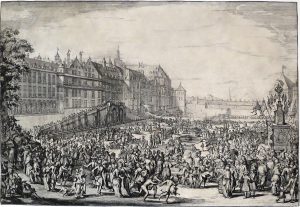Eau-forte, TC 36,8 x 54,5 cm, papier vergé non filigrané, fixée par les coins sup. sous passe-partout (rognée sur TC). Importante planche faisant partie d'une série de 9 figurant la joyeuse entrée de l'empereur Léopold suite à sa victoire sur les Turcs à Vienne en 1683. Grande scène figurant une foule de nobles et de bourgeois se rassemblant dans la Warande devant le palais des ducs de Bourgogne sur le Coudenberg. Belle évocation, très vivante.