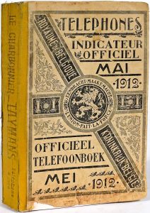 Mai - Mei 1912. In-8° agenda : 936 pp. Broché (dos de toile jaune renouvelé, plats de la couv. frottés). Indispensables avant l'ère Internet, les annuaires sont aujourd'hui plutôt considérés comme de sympathiques curiosités. Celui-ci couvre en près de mille pages toute la Belgique et renseigne déjà le n° de téléphone du Chalet de la Forêt à Uccle (Bruxelles).