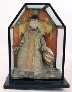 Cire (?) habillée, s.l., XIXe s. Saint Joseph et l'enfant Jésus. Cire ou matériau moulé, tissu. Dans une boîte vitrée hexagonale, 37,5 x 29 x 19,5 cm, socle recouvert de papier brun, pourtours scellés d'une bande collante. Personnage détaché.