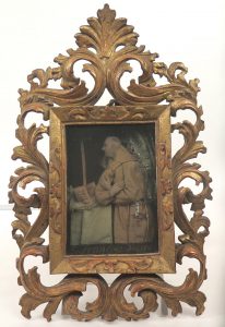 2 figurines de même format (+/- 14 x 10,5 cm) : saint François en prière devant la croix & la Vierge et ste Jeanne enfant. Draperies de soie bleu clair ou crème dans la partie dr., sur fond noir. Banderoles légendées dans la partie inf. Ste Jeanne semble contenir 2 petites reliques. Impressionnants cadres à rinceaux et palmettes.