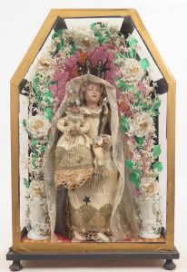 La Vierge tenant l'enfant Jésus sur un bras, tous deux richement vêtus de soie, dentelle et galons dorés, de bijoux nacrés et de couronnes en perles de verre ou fil métallisé. Symétriquement disposés aux pieds de la Vierge, 2 vases en porcelaine blanche ornée de filets dorés desquels émerge une large guirlande de feuilles et de fleurs. Sur fond de papier décoré dans les tons roses. Jolis visages, finement détaillés.