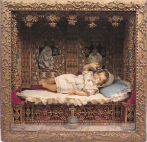 Variation sur l'iconographie du petit Jésus de Prague, avec l'enfant étendu, la main gauche bénissant et le globe couronné posé sur le sol. Sous le matelas de soie bleue et blanche et alentour, important décor de papier roulé et doré sur tranches enchâssant 3 petits images gravées et rehaussées et 1 petite image habillée. Très jolie figurine aux yeux bleus, finement détaillée, et beau décor de papier roulé incluant de petites perles oblongues de verre nacré.