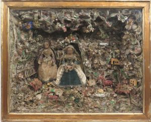 Marie assise au centre, richement vêtue; à sa gauche, une autre femme debout. Dans un décor de papier froissé simulant une grotte ou un jardin clos, avec barrière à gauche, animaux en papier mâché sur le sol ou suspendus à la muraille, maisonnettes, qqs coquillages, qqs fleurs en tissu..., le tout semé de particules brillantes.