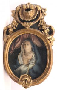 Deux jolies pièces en pendant représentant la Vierge transpercée d'une épée et le Christ les mains liées, tenant un roseau, le visage et la poitrine ensanglantés. Personnages encadrés par une draperie d'étoffe rose, sur fond noir. Visages expressifs, finement détaillés.