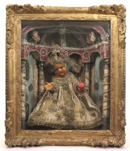 Grande figurine en cire très colorée, figurant le Christ enfant bénissant d'une main et tenant de l'autre un globe couronné. Luxueusement vêtu de soie et de dentelle, la tête surmontée d'une couronne (sans cheveux, oreilles mal dessinées). Dans un riche décor de colonnes ornées de perles argentées et de fragments de miroir et surmontées d'un dais orné de même. Le tout sur fond de soie brochée bleue ou rose. Vêtements et décor sophistiqués.