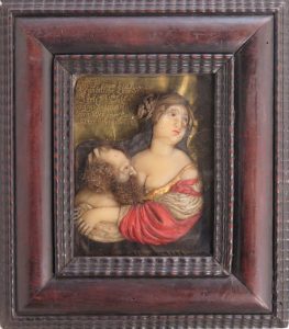 Tableau de cire (+/- 11 x 9 cm) figurant une jeune femme allaitant un vieillard. Cette scène déjà relatée par divers auteurs anciens se rencontre assez fréquemment dans l'iconographie, notamment dans des fresques de Pompéi, des tableaux de Rubens, etc. Sur fond de papier doré avec inscription en allemand dans le coin sup. g. Joint, même technique : La crucifixion. Cire, tissu, éléments végétaux, matériaux divers. Dans une boîte vitrée, 23 x 18,5 x 4,5 cm, cadre de bois doré, côtés et fonds couverts de papier vert. Personnages en cire de facture assez primitive, décor d'élements végétaux, fond brodé. (2 pcs)