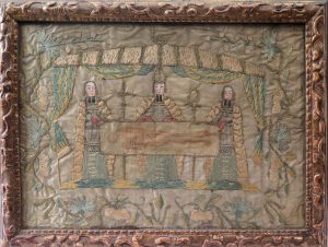 Sauf les visages et le corps du gisant, pièce entièrement brodée de soie et de fil doré sur fond de soie bise. Linceul et personnages surmontés d'un dais et cernés d'une guirlande florale.