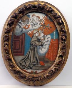 Saint François et l'enfant Jésus. Cadre ovale mouluré doré, 24,5 x 20 cm. Gravure gouachée figurant le saint à genoux devant un autel, étreignant l'enfant Jésus. D'après une note, cadre italien et verre d'origine. - S. Agnes. Cadre en bois sculpté, 25,5 x 20 cm. Pièce entièrement gouachée sur peau de vélin. Lég. brunie. Cadre fendillé, petits travaux de ver. - Marie présentant Jésus à ses parents. Cadre mouluré doré, 19 x 22 cm. Un petit trou de ver dans la partie dr. Image entièrement gouachée, probablement sur peau de vélin.
