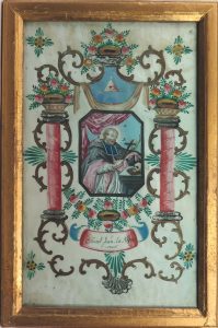 Grande image (34 x 21 cm) rehaussée à l'or figurant le saint dans un cadre octogonal surmonté d'une représentation de l'oeil de Dieu et entouré de 2 colonnes portant des paniers fleuris. Jolis coloris.