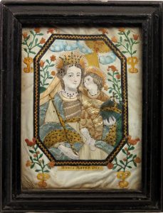 Image habillée, Allemagne, s.d., 2 pcs. Maria Mater Dei et S. Jacobus Maior. Papier gravé, tissu, papier doré, paille. Cadres peints en noir, 21 x 17 cm. Minimes bruniss. et plis dans le vélin. Bon ensemble.