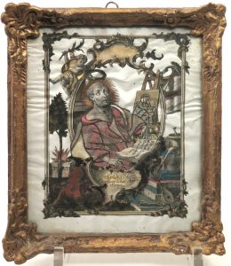 Image habillée, Allemagne, s.d., 4 pcs. Les 4 évangélistes. Papier gravé, tissu, papier doré. Cadres moulurés dorés, 22 x 18 cm. Bon ensemble.
