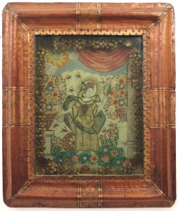Image habillée, s.l., s.d. Catarina. Tissu, papier gravé, paille. Dans une boîte vitrée, 26 x 21 x 4 cm, cadre en marqueterie de paille, côtés et dos couverts de papier peigne. Petits défauts au cadre.