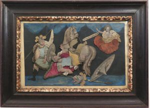 Facture et dimension (19,5 x 32 cm) +/- similaires. Visages, mains et certains éléments du décor gouachés sur papier, vêtements en soie brochée avec galons métallisés. Sujets : Suzanne et les vieillards. - la conversion de saint Paul sur le chemin de Damas. Les 2 pcs sur fond noir bordé de bleu foncé. Pièces assez animées, Suzanne placée dans un décor architectural avec fontaine et colonnes, Paul tombant de cheval à la vue de Dieu surgissant d'un nuage rouge, avec phylactère "Saule quid me persequeris".